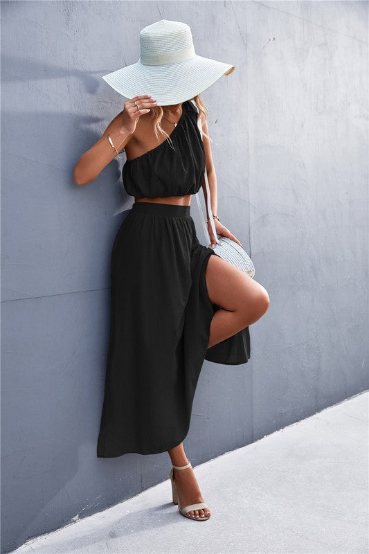 - Two Piece Set- One Shoulder Crop Top - High Waist Maxi Skirt - Unlined