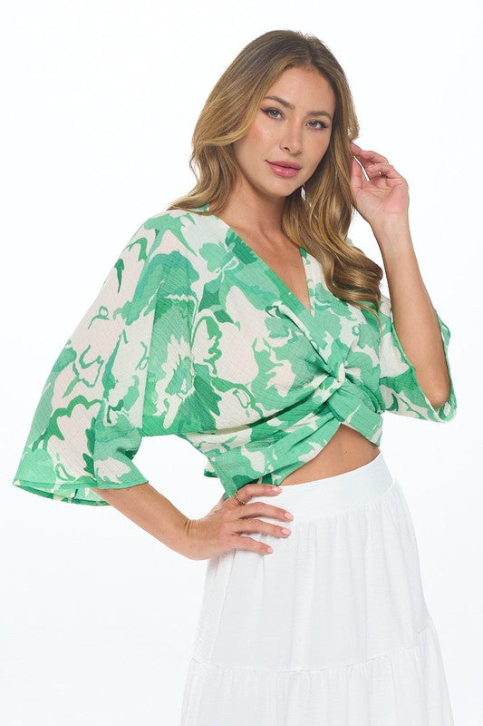 Made in USA Floral Print Mid Sleeve Top with Front Twist. Fabric content: 100% Polyester. Pucker Chiffon.
