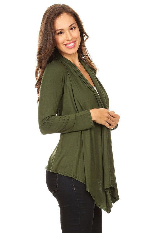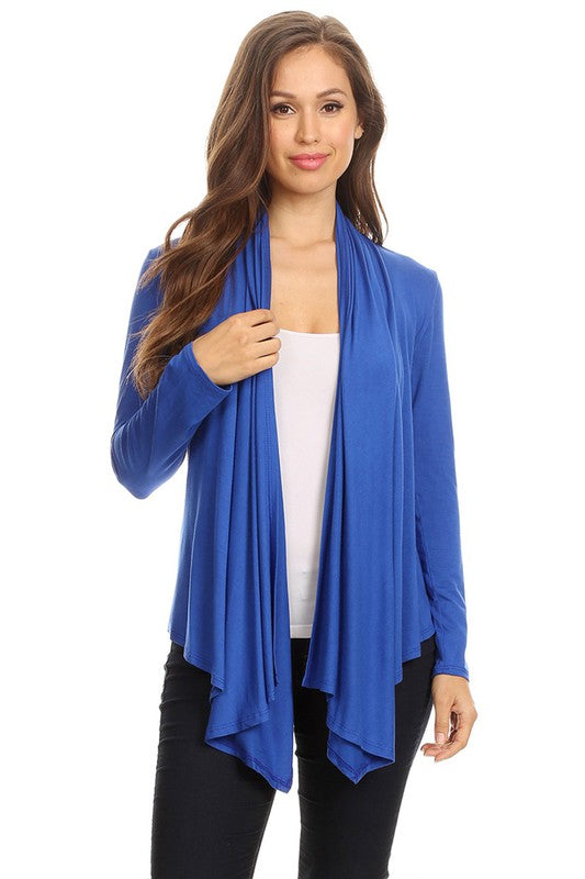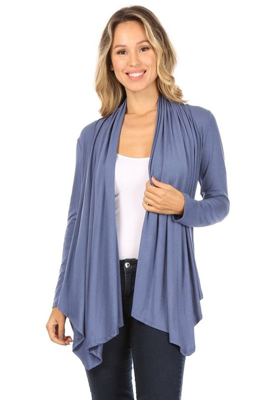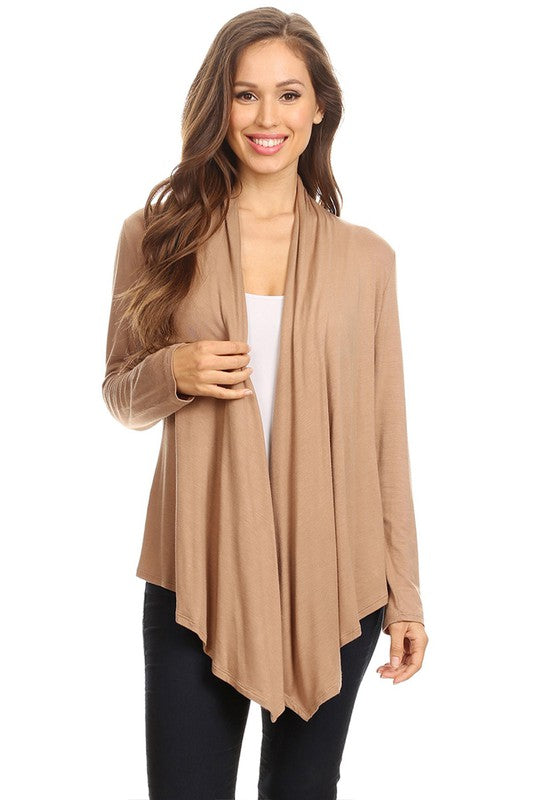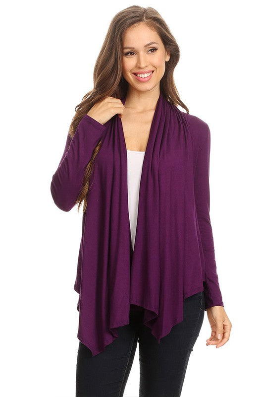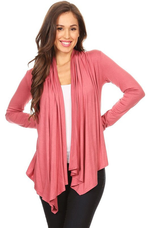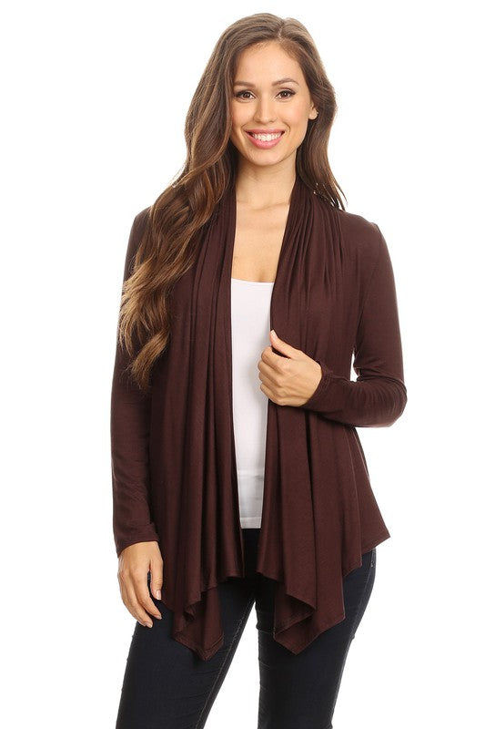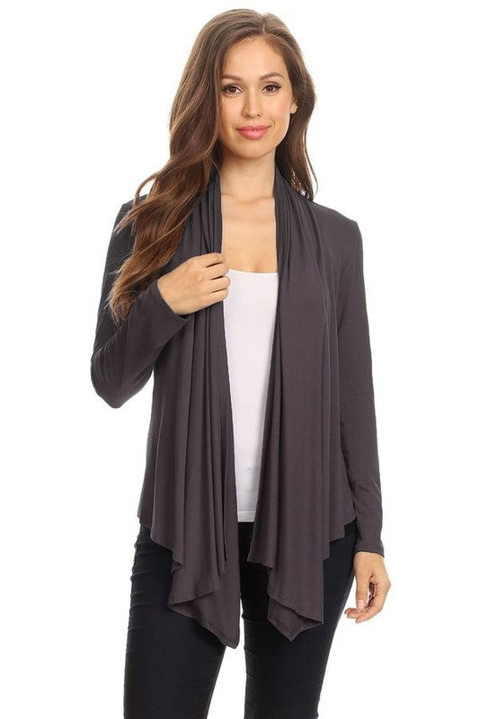This cardigan is made from a soft and lightweight fabric that drapes nicely on the body. The solid color of the fabric gives the cardigan a clean and classic look, making it a versatile piece that can be dressed up or down.