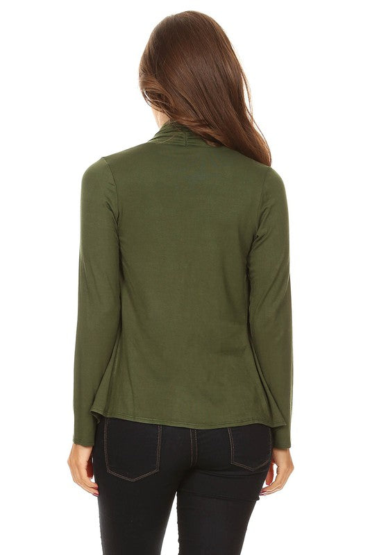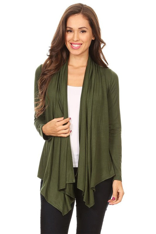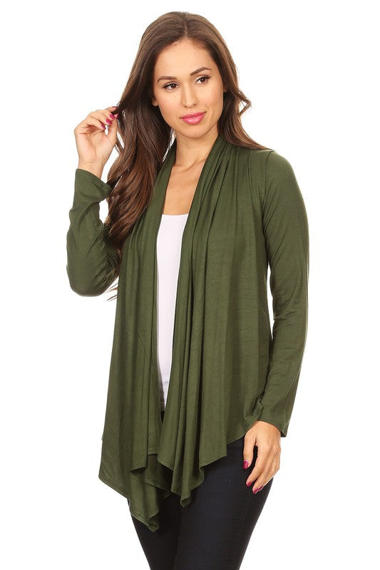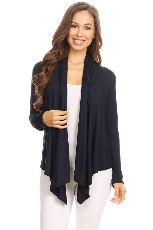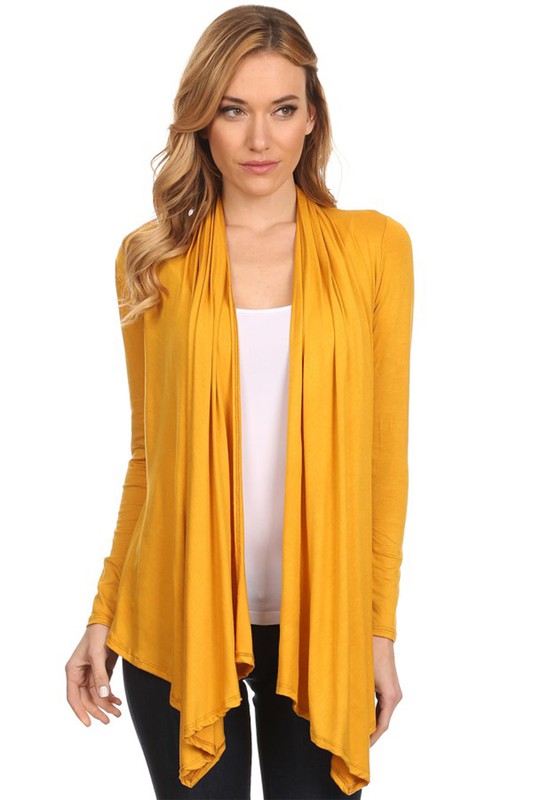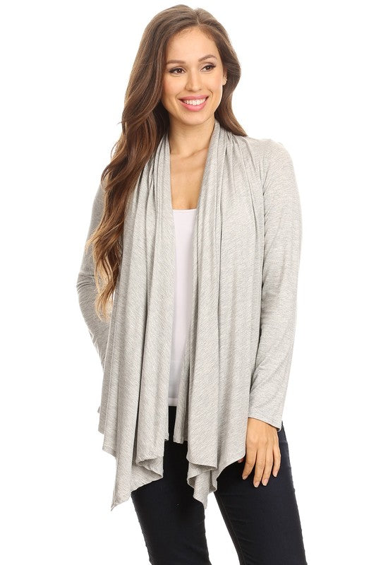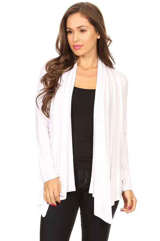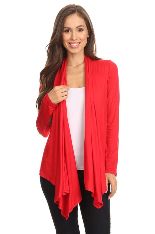 This cardigan is made from a soft and lightweight fabric that drapes nicely on the body. The solid color of the fabric gives the cardigan a clean and classic look, making it a versatile piece that can be dressed up or down.