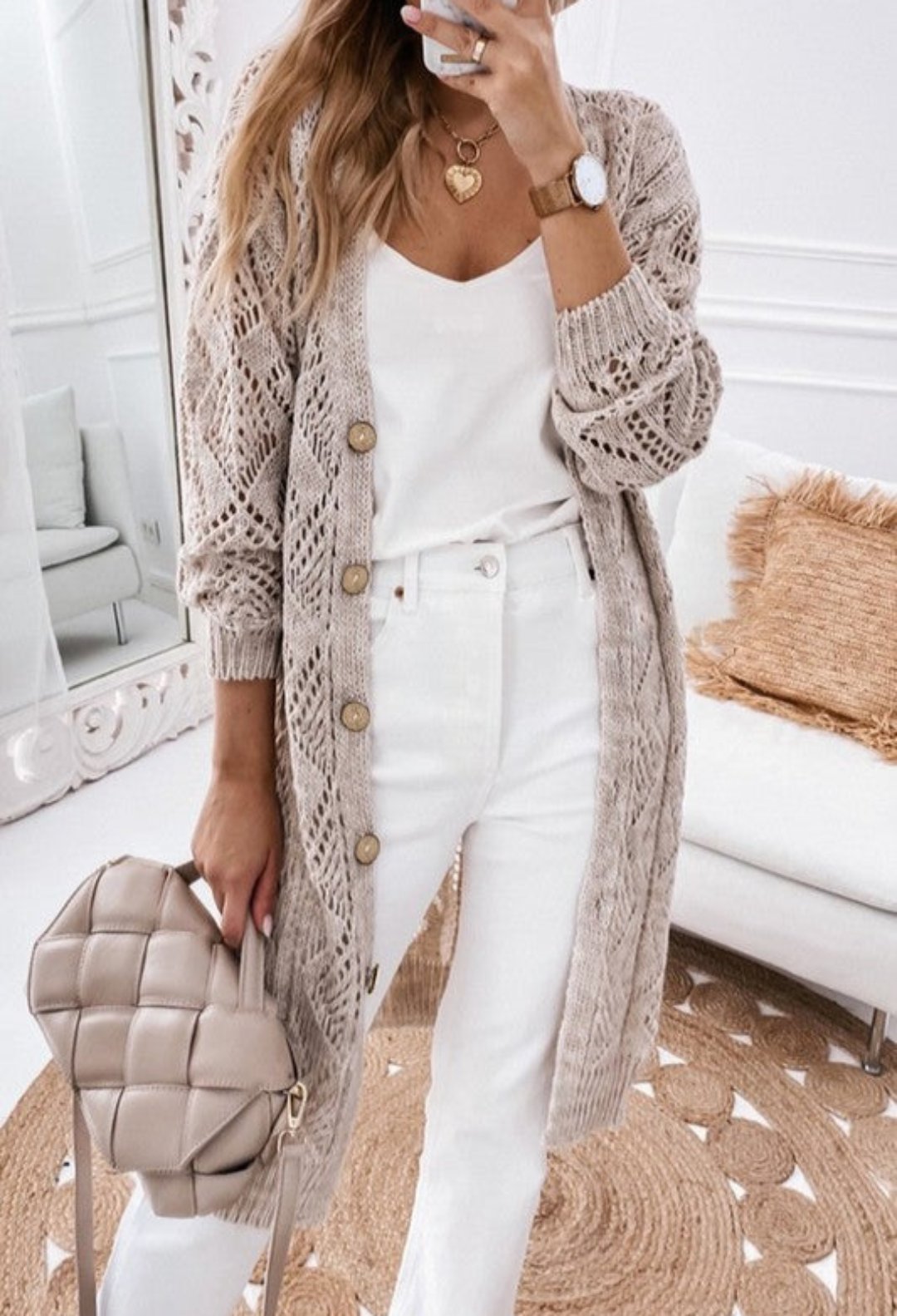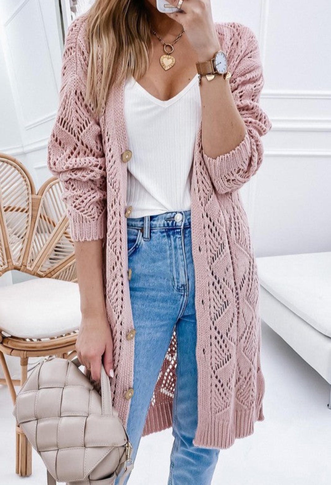 The hollowed knit design adds a unique and trendy element to the cardigan, creating a subtle peek-a-boo effect.